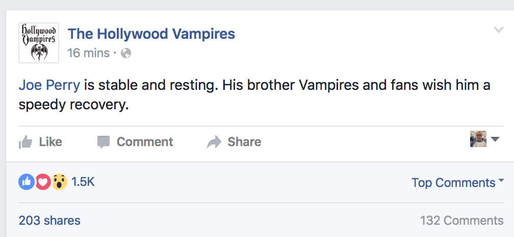 In the early morning hours following the performance and Perry’s collapse, the band posted a reassuring message on their Facebook page…