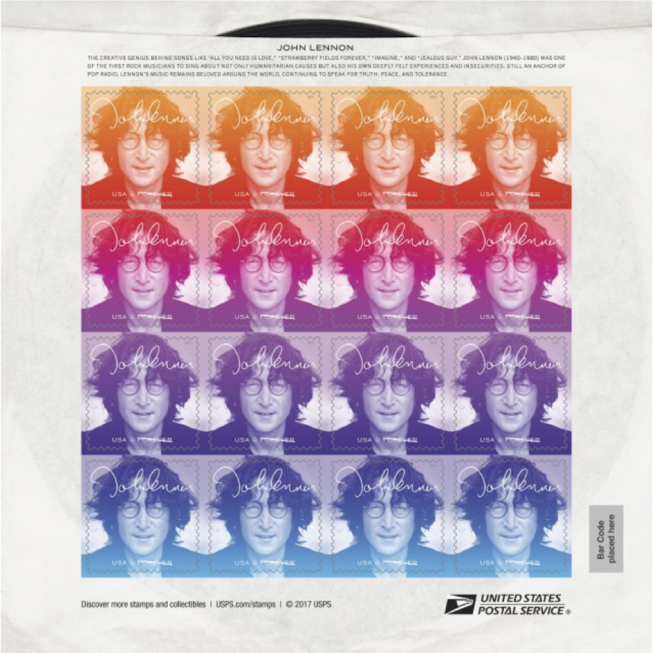 The stamp pane is designed to resemble a vintage 45 rpm record sleeve. One side of the pane includes the stamps and brief text about Lennon’s legacy, with the image of a sliver of a record seeming to peek out the top of the sleeve.