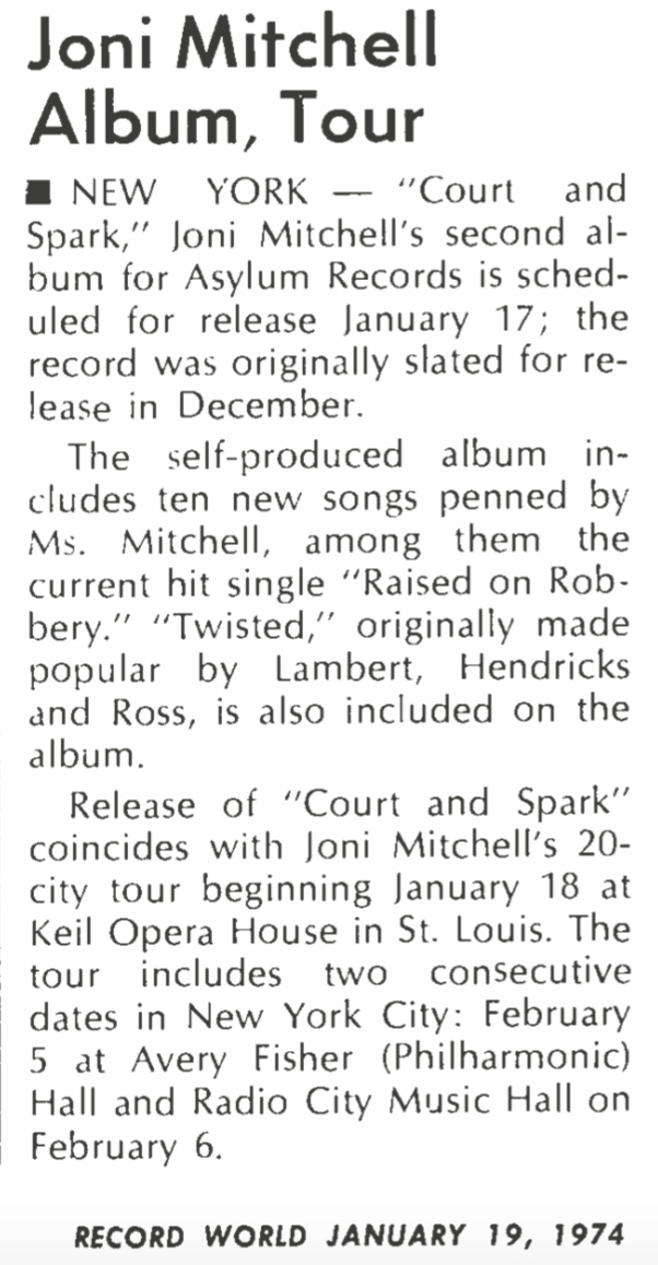 The album was received warmly by critics and the marketplace, where it reached as high as #2 on the album chart, and would in the long term rank as the best-selling record in Mitchell’s catalog. It also served as a signpost, highlighting an artist intent on following her muse wherever it might lead, which soon would entail far more experimental paths. As much as it sounds on its surface like an easy-listening jazz-pop record, Court and Spark was a significant pivot point, angling toward a future in which its creator would champion experimentation, and defy expectation.