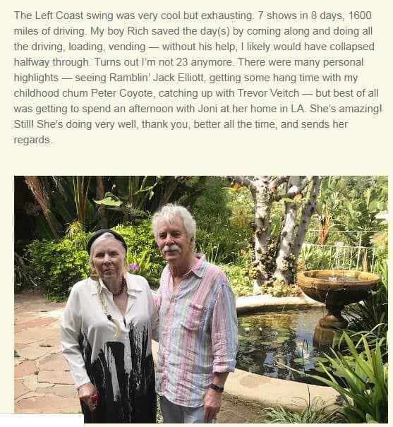 Joni Mitchell shared news on May 29, 2019, of a recent visit she received from a friend. On her social platforms, the famed singer-songwriter shared a picture taken with fellow musician Tom Rush. Rush had been touring on the “left coast” and recapped some highlights. “Best of all,” he wrote, “was getting to spend an afternoon with Joni at her home in LA. She’s amazing! Still! She’s doing very well, thank you, better all the time, and sends her regards.”