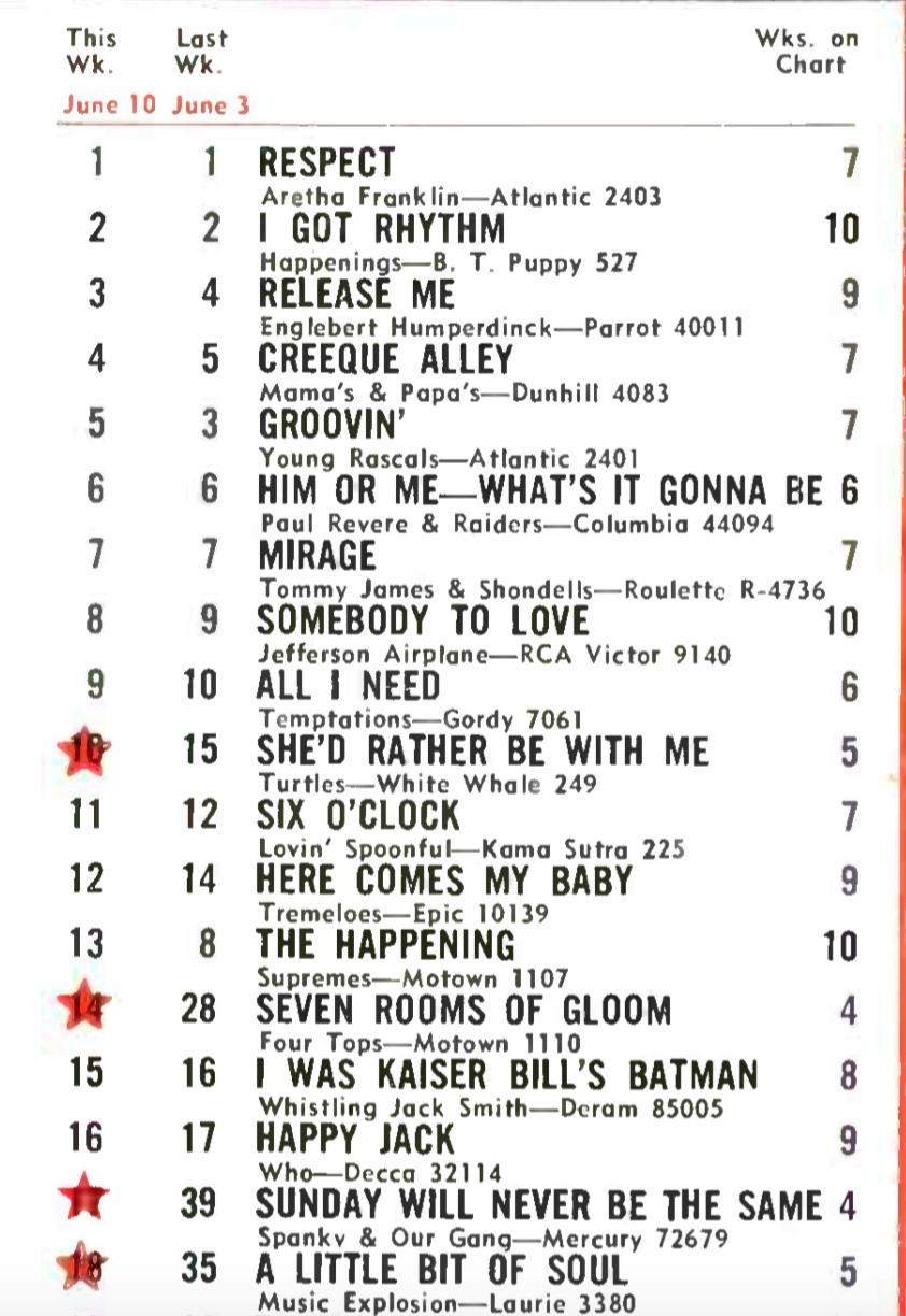 But there was still room for the weird and the silly. Exhibit A: “I Was Kaiser Bill’s Batman,” by Whistling Jack Smith. To call “Kaiser…” anything but a trifle, a toss-away novelty, would be to give it too much credit, yet it was undeniably catchy—you could hum along to it with ease or, more appropriately, whistle to it. Odd thought it may have been, the single started to sell on both sides of the Atlantic, reaching #5 in the U.K. shortly before starting its ascent in the States. Released on the Deram label, “I Was Kaiser Bill’s Batman” entered the chart on April 29, 1967. It peaked at #15 on Record World on June 10 and two weeks later it was gone.