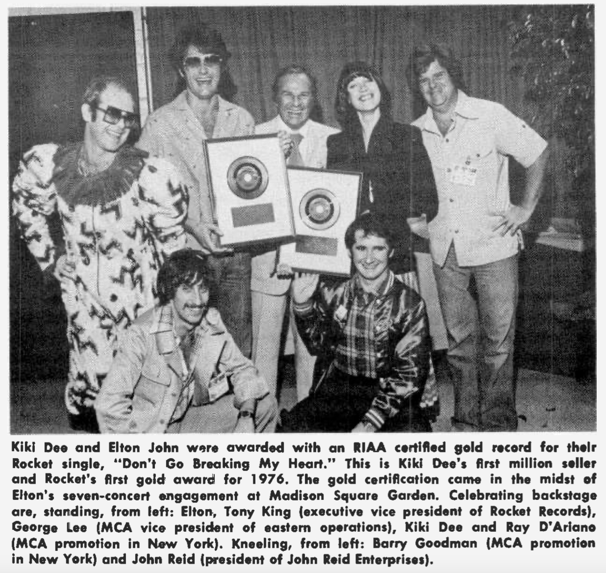 Kiki Dee is seen celebrating the Gold record award with Elton John with his management and label brass in a photo that appeared in the Sept. 4, 1976, issue of Record World.