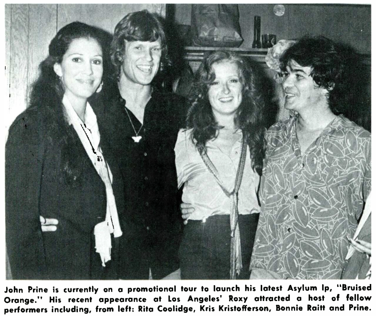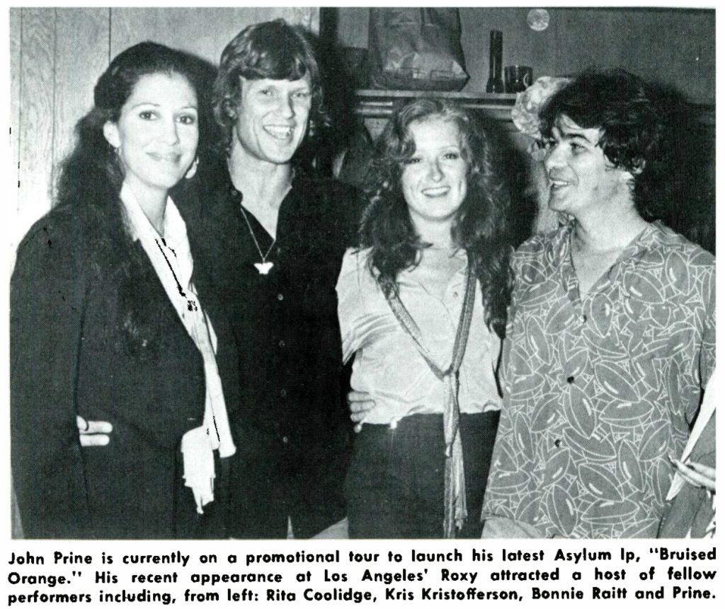 Coolidge and Kristofferson (at left) with friends Bonnie Raitt and John Prine (Photo from Record World magazine, 1978.)