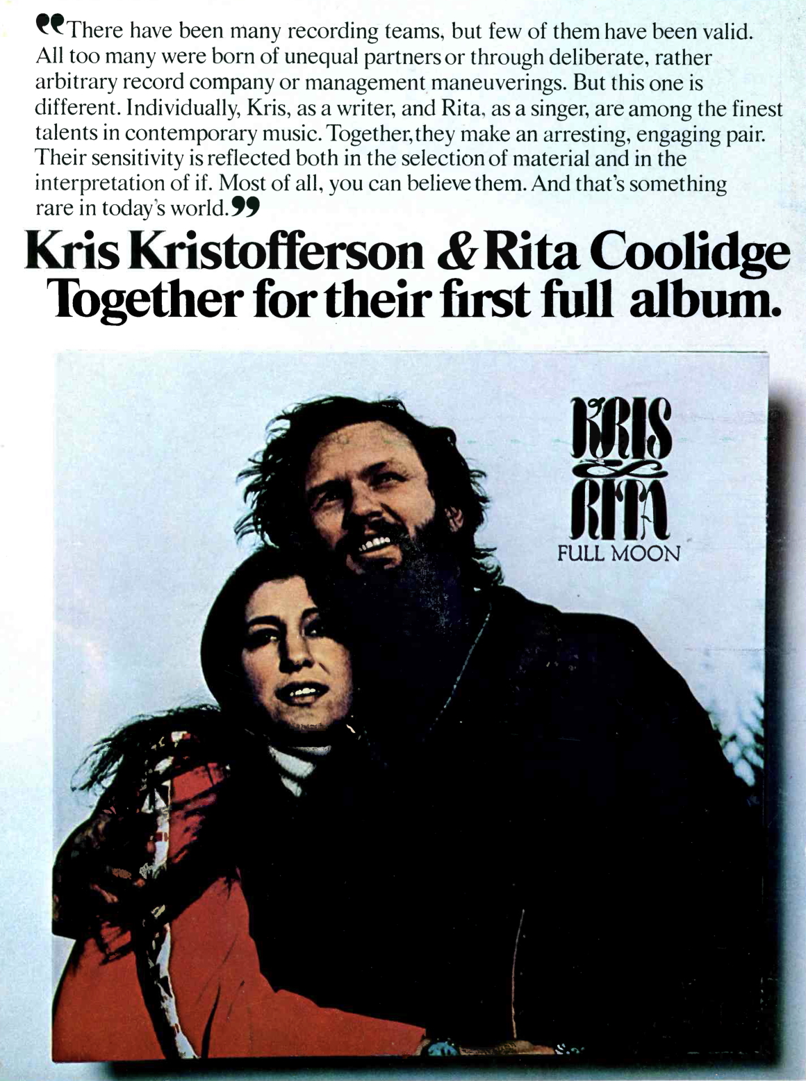 They were married August 19, 1973, and released the duet album, Full Moon, a month later on September 19. Looking back on the album decades later for Uncut magazine, Kristofferson recalled, “I think it was probably my idea. I love singing with people anyway, and I loved to sing with Rita together in harmony. I grew up with the Everly Brothers, harmony was always something I loved, and Rita sang backup with people all the time. Harmony came easily for both of us, it was very natural. The songs were more or less what we felt we wanted to do and what the producer David Aderle felt we could do well. It was a very different thing to what I was used to. [Rita and I] worked well together at first, and it hadn’t gotten to where we were fighting—yet.”