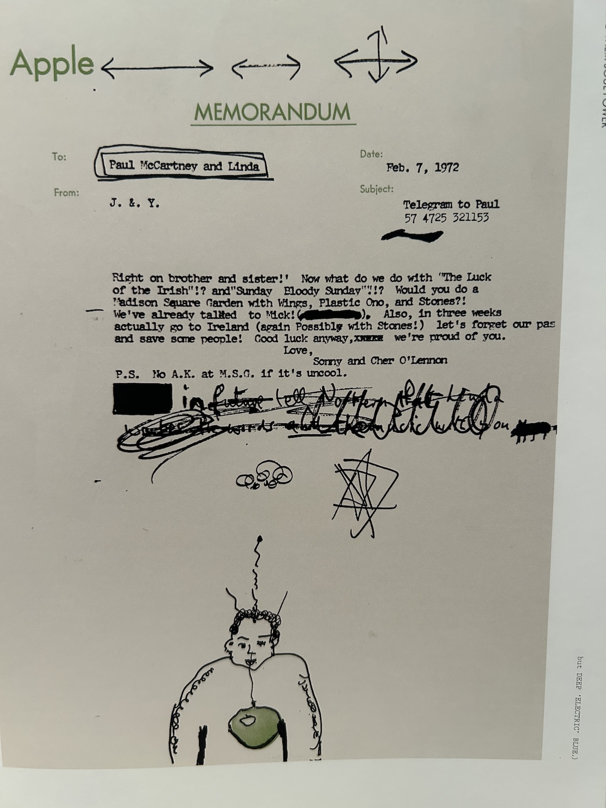 Right on brother and sister!’ Now what do we do with “The Luck of the Irish” and “Sunday Bloody Sunday””!? Would you do a Madison Square Garden with Wings, Plastic Ono, and Stones?! We’ve already talked to Mick!(blacked out). Also, in three weeks actually go to Ireland (again Possibly Stones!) let’s forget our past and save some people! Good luck anyway, xxxxx we’re proud of you.