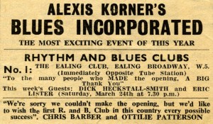 And, on this date in 1962, the two friends and now bandmates might not have traveled, in a car borrowed from a friend’s father, to the Ealing Club, to see Alexis Korner’s Blues Incorporated, one of the hottest rising British blues bands.