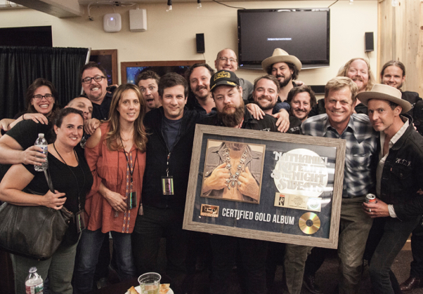 Nathaniel Rateliff & The Night Sweats posing with their first Gold record (Photo: Rett Rogers; used with permission)