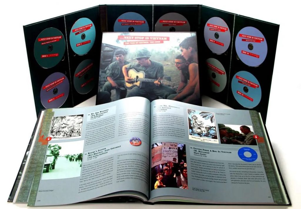 An accompanying 304-page, LP-sized hardcover book, which includes an introduction by Country Joe McDonald, enriches the listening experience. Among its contents: an article about how the collection was compiled and organized, a history of the war, detailed notes about every track and artist, a scrapbook of Vietnam War photos and alphabetical lists of all the artists and songs.