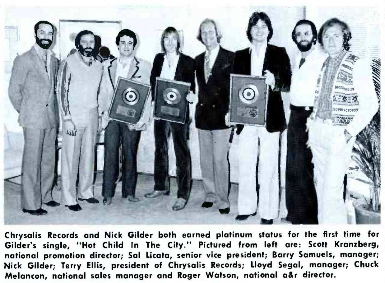 This photo of Gilder receiving a Platinum single award appeared in the Jan. 27, 1979 issue of Record World
