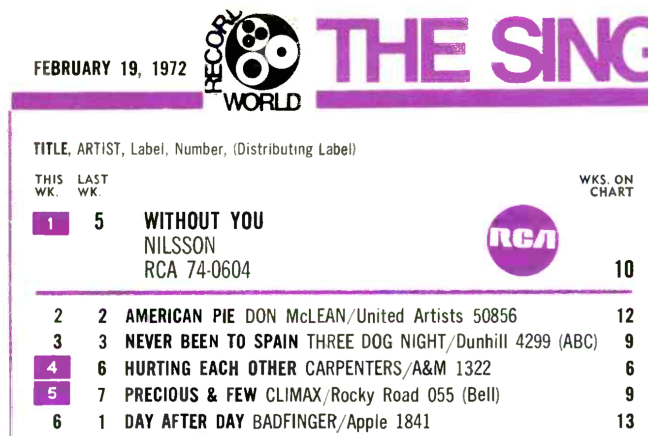 “Without You” topped the U.S. singles chart on Feb. 19, 1972