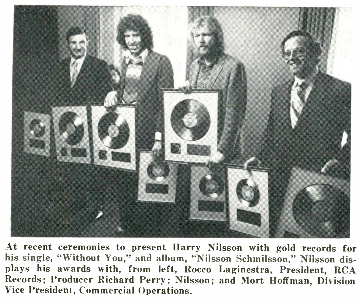 Nilsson and Richard Perry receiving Gold albums for “Without You” and Nilsson Schmilsson by the RCA brass, in March 1972