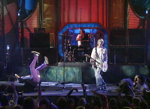 As Novoselic later recounts in his column in the Seattle Weekly: “One should take the stage in a good frame of mind, but I wasn’t there… I’m plugged into some awful bass rig that’s distorting terribly. I can barely hear what I’m playing, and the tone deteriorates into an inaudible mess. F**k it – time for the bass-toss schtick. Up it goes!!!!! I always try to get good air – I bet I hit over 25 feet, easy! But no matter how high it went, I was not on my game – the only time I’ve ever dropped it was then in front of 300 million people. Ouch! I was fine, but I faked like I was knocked out, perhaps expressing my inner torment over a taxing evening. (Maybe I was just embarrassed.)”