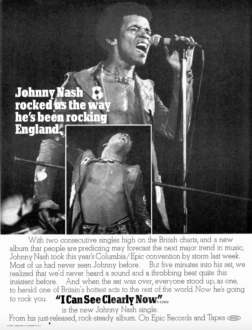 This ad for Johnny Nash’s #1 hit appeared in the Aug. 19, 1972 issue of Record World. It was the singer’s 32nd birthday.