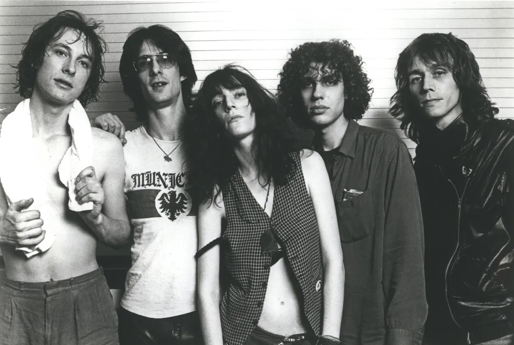 The Patti Smith Group (l. to r.): Jay Dee Daugherty, Lenny Kaye, Patti Smith, Richard Sohl, Ivan Kral (late ’70s publicity photo)