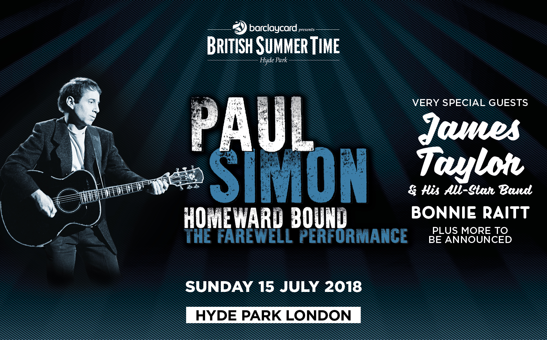 On Jan. 30, 2018, nearly a week before the official announcement of Paul Simon’s farewell tour*, the British Summer Time series in London’s Hyde Park shared the news that the acclaimed singer-songwriter would be headlining a concert there. On Feb. 5 came news of Homeward Bound – The Farewell Tour across North America, the U.K. and Europe, with Simon and his band bringing a career-spanning repertoire of timeless hits and classic songs.