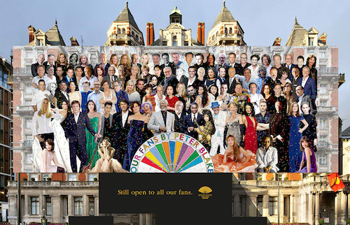 The British pop artist Sir Peter Blake, best known for co-creating the album cover for The Beatles’ Sgt. Pepper’s Lonely Hearts Club Band nearly 50 years ago, has unveiled the biggest collage of his career. Measuring approximately 230 x 80 feet, the image covers the front façade of the Mandarin Oriental Hyde Park in London and will remain in view until May while the hotel undergoes restoration. The artwork, title “Our Fans,” was commissioned by the hotel’s owners and its design was inspired by the Sgt. Pepper cover.