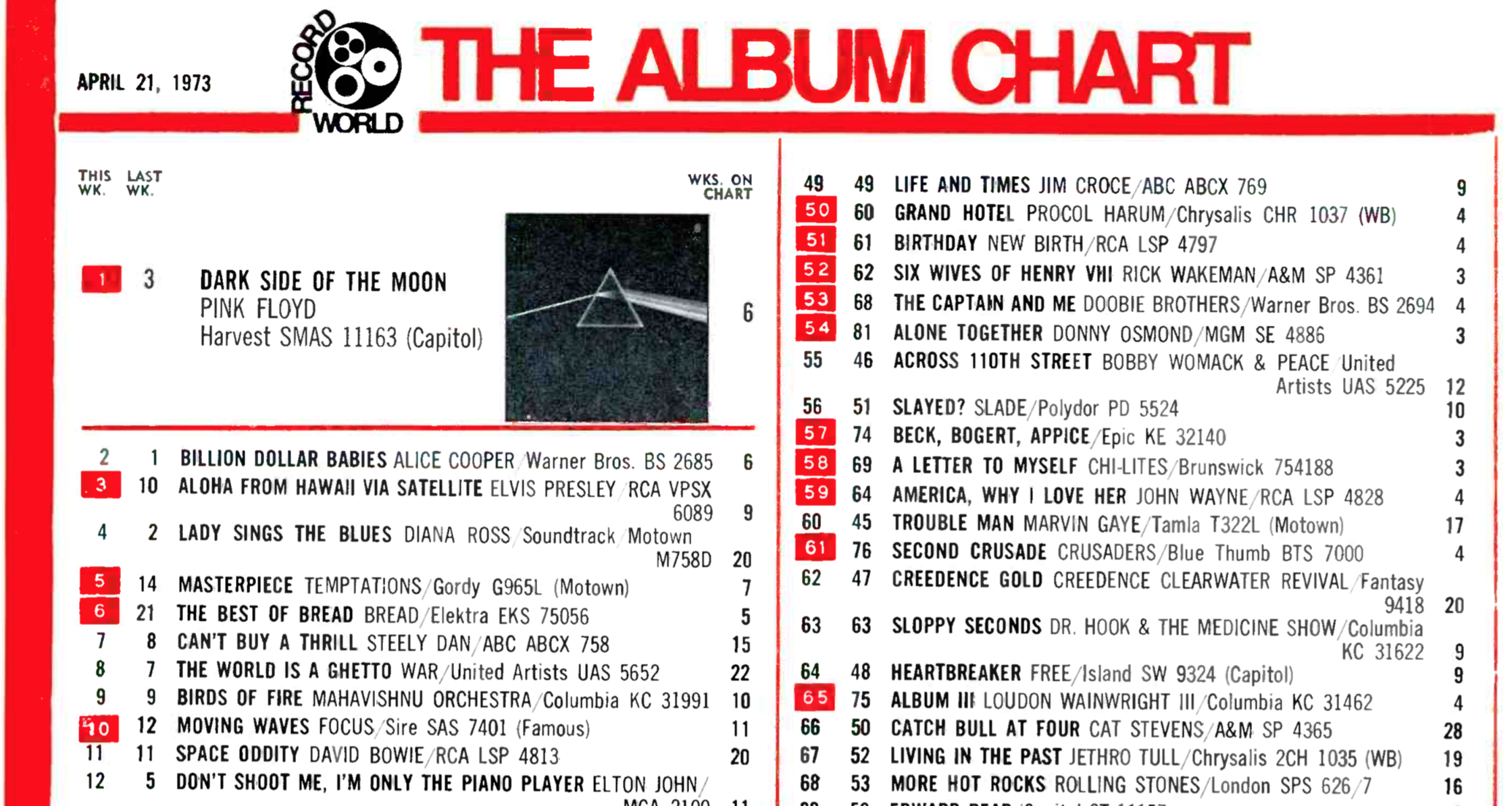 On April 21, 1973, just six weeks after it was released, Dark Side of the Moon topped the Record World album chart. It was replaced at the top the next week by Elvis Presley’s Aloha From Hawaii via Satellite and never returned to #1.