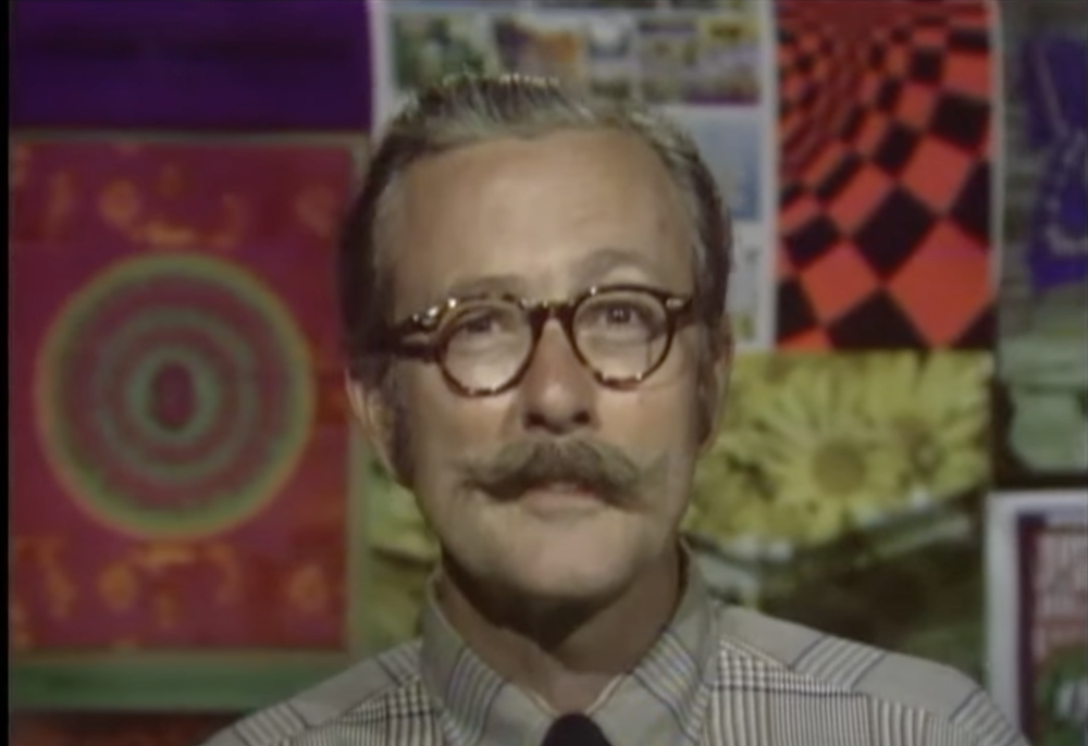 Ralph J. Gleason poses in front of a wall of San Francisco concert posters (Screen grab from 1968 film West Pole, YouTube)