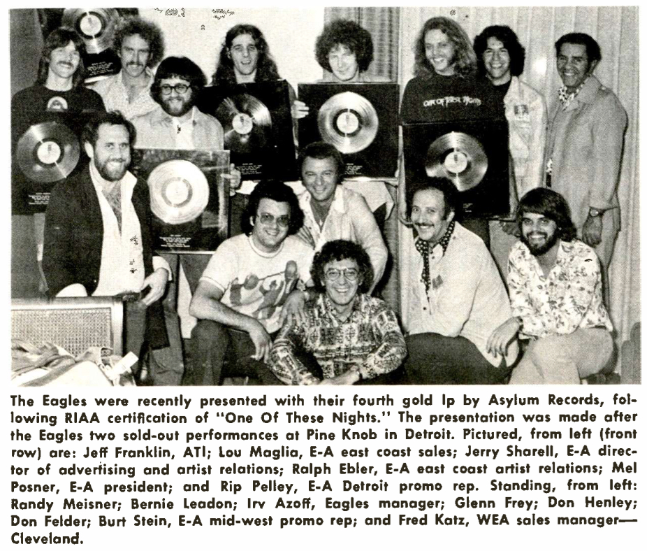 This photo of Eagles receiving a Gold album for One of These Nights appeared in the Aug. 2, 1975 issue of Record World. Randy Meisner is at far L in the back row.