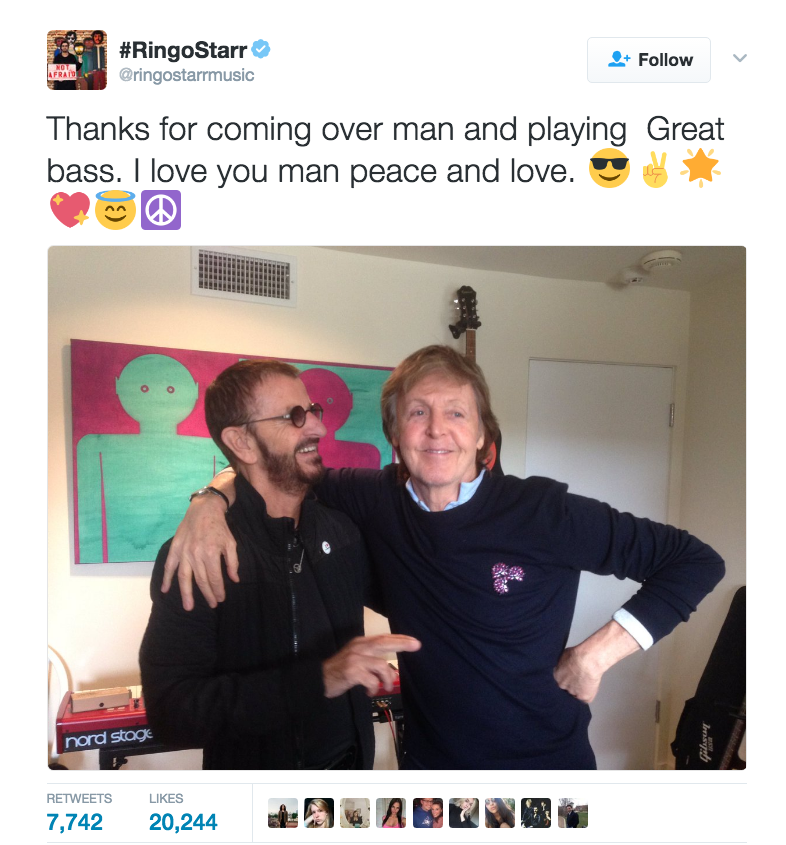 He’s 76 years old and he’s still going strong. Mr. Peace and Love himself, Ringo Starr, is in the studio recording his next album, and he’s got a little help from some old friends, including Paul McCartney. A tweet on Ringo’s Twitter page shows the two former Beatles—Paul’s arm draped around Ringo (see tweet at left)—with the text reading, “Thanks for coming over man and playing Great bass. I love you man peace and love.”