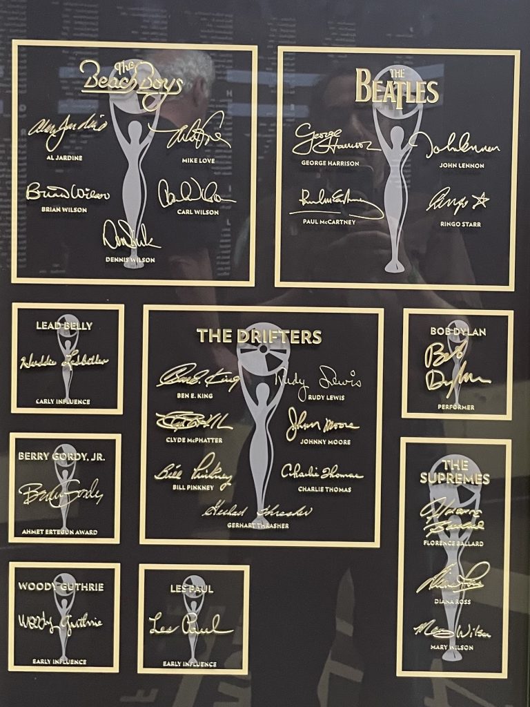 Level 3 is what it’s ostensibly all about, though it’s not that exciting to look at. This is where all of the inductees, numbering more than 300 when we attended in the summer of ’21, get name-checked on smallish plaques that list their names and display their signatures. The inductees are arranged year by year, beginning with the class of 1986. We are reminded that the latest class includes Depeche Mode, The Notorious B.I.G. and Whitney Houston, along with a few actual rock bands (T. Rex, Doobie Brothers, Nine Inch Nails). And right away we’re drawn back into that controversy about who deserves induction and who doesn’t. Maybe it’s best if we move on to Level 4, which is…