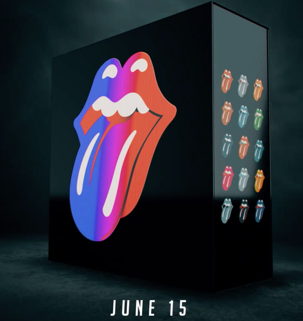 As the clip begins, the sound of a needle hitting a vinyl record is heard, followed by the first 13 seconds of the band’s 1981 hit single, “Start Me Up.” At the same time, the graphic shows the Stones‘ familiar tongue and lips logo getting animated and then begin to spin as if on a turntable. We then see what certainly appears to be a boxed set, whose spine reveals 15 miniature Stones logos.