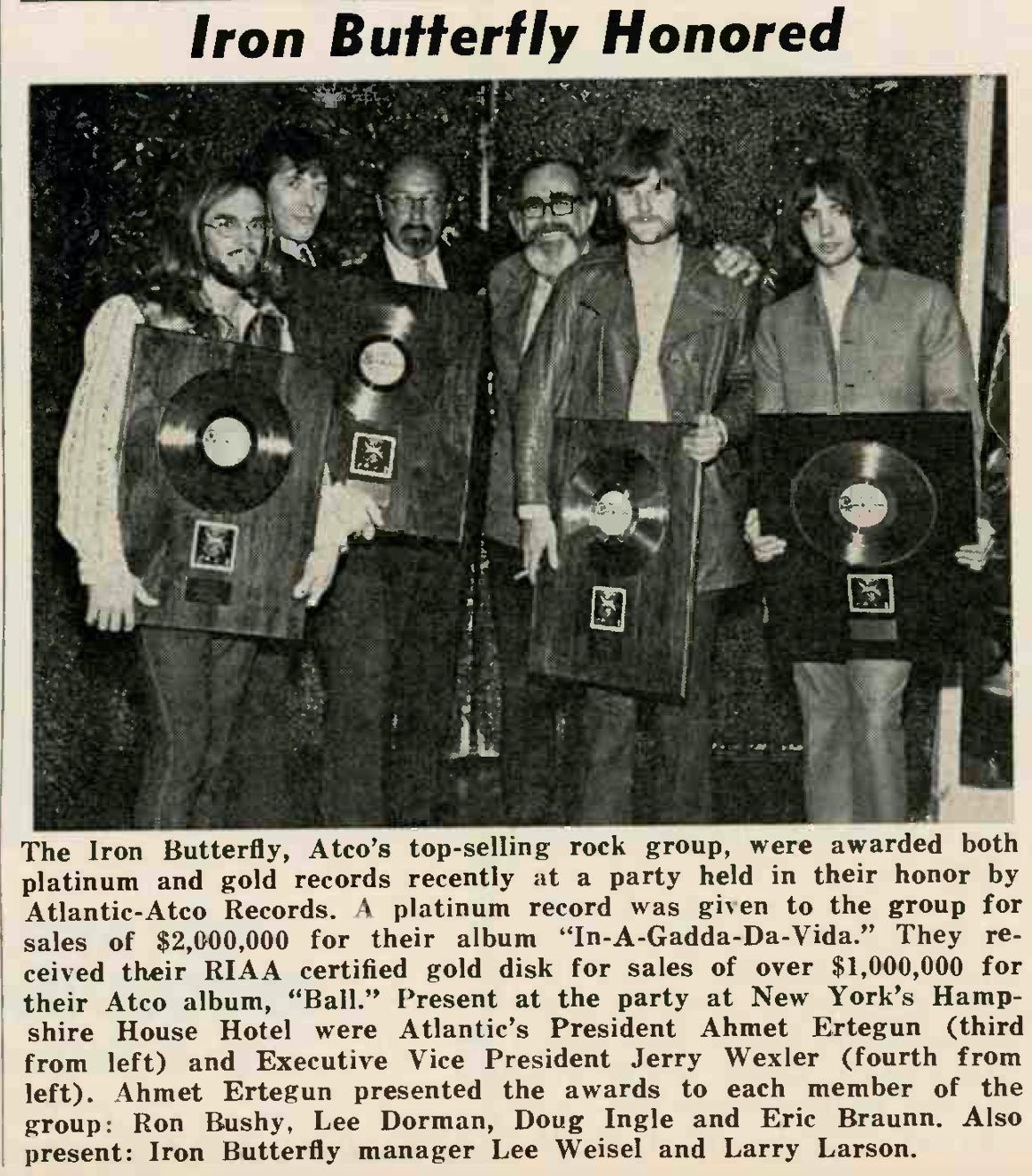 Iron Butterfly receiving Gold and Platinum awards for the In-a-Gadda-Da-Vida album. This photo appeared in the Sept. 6, 1969 issue of Record World