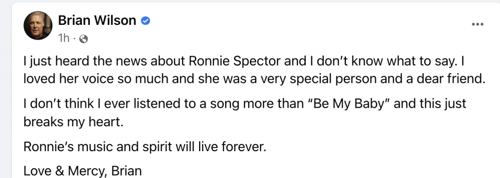 “…started hummin’ a song from 1962,” he wrote. “‘Be My Baby’ is among my favorite songs of all time. Ronnie was such a great singer and a wonderful person. I will miss her like crazy.”