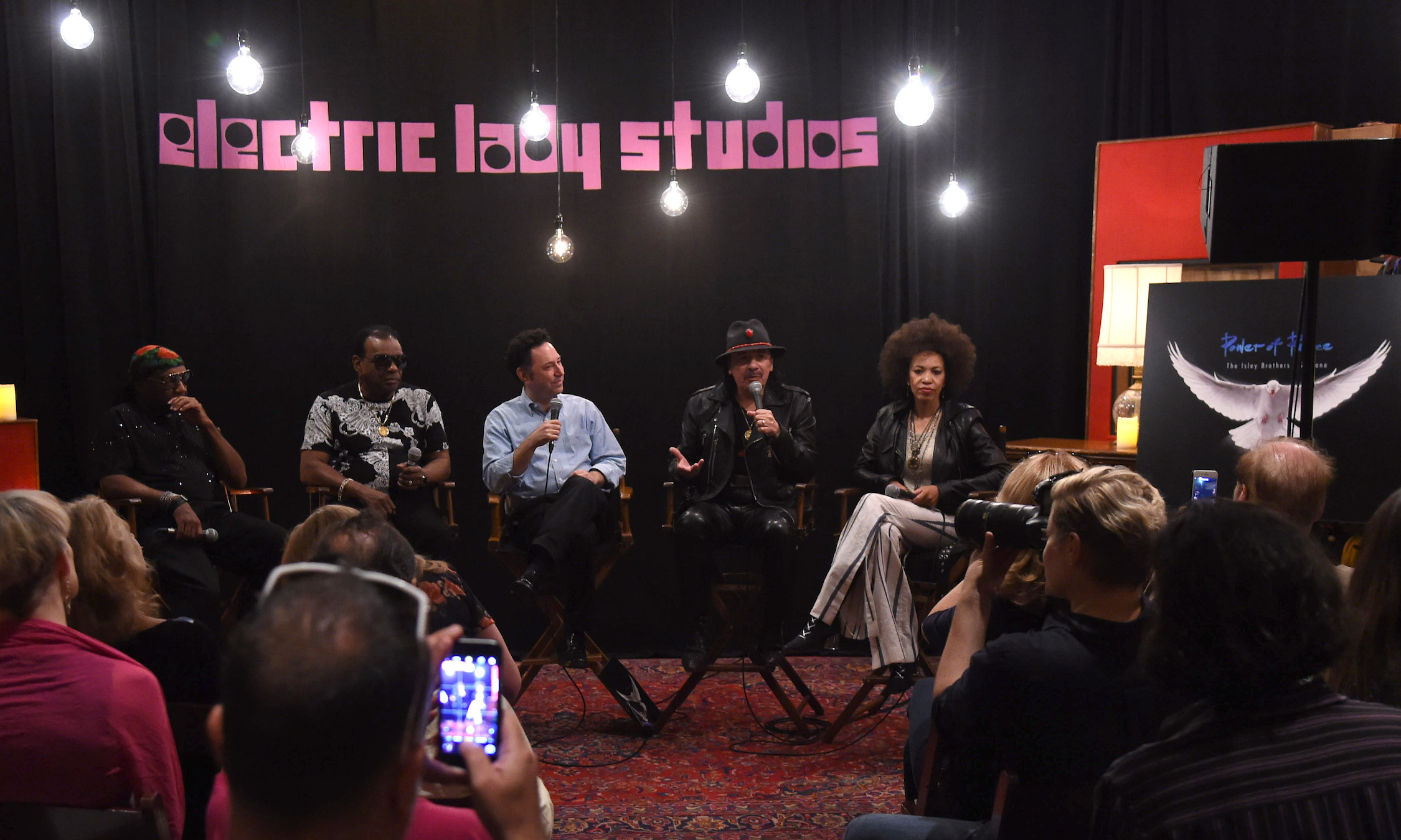 The spirit of Jimi Hendrix was evident as Carlos Santana and his wife Cindy Blackman Santana joined Ronnie Isley and Ernie Isley of the Isley Brothers at the New York City studio that the guitarist built. The quartet was at Electric Lady Studios on Aug. 1, 2017, to talk about their new recording collaboration, Power of Peace, which was released July 28 by Sony Music’s Legacy Recordings. But the conversation occasionally veered back to the guitar god. And in a room with two in the flesh who could justifiably be called just that, it was Hendrix’s impact that was discussed often at the press gathering.