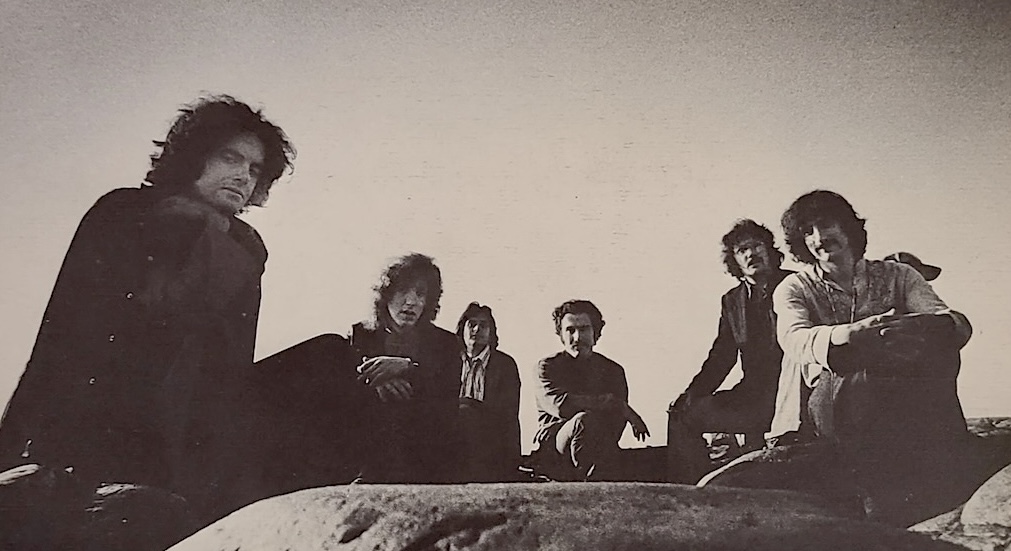 Seatrain, in an early ’70s band publicity photo (Peter Rowan in center with striped shirt, Richard Greene at far left, Andy Kulberg upper right)