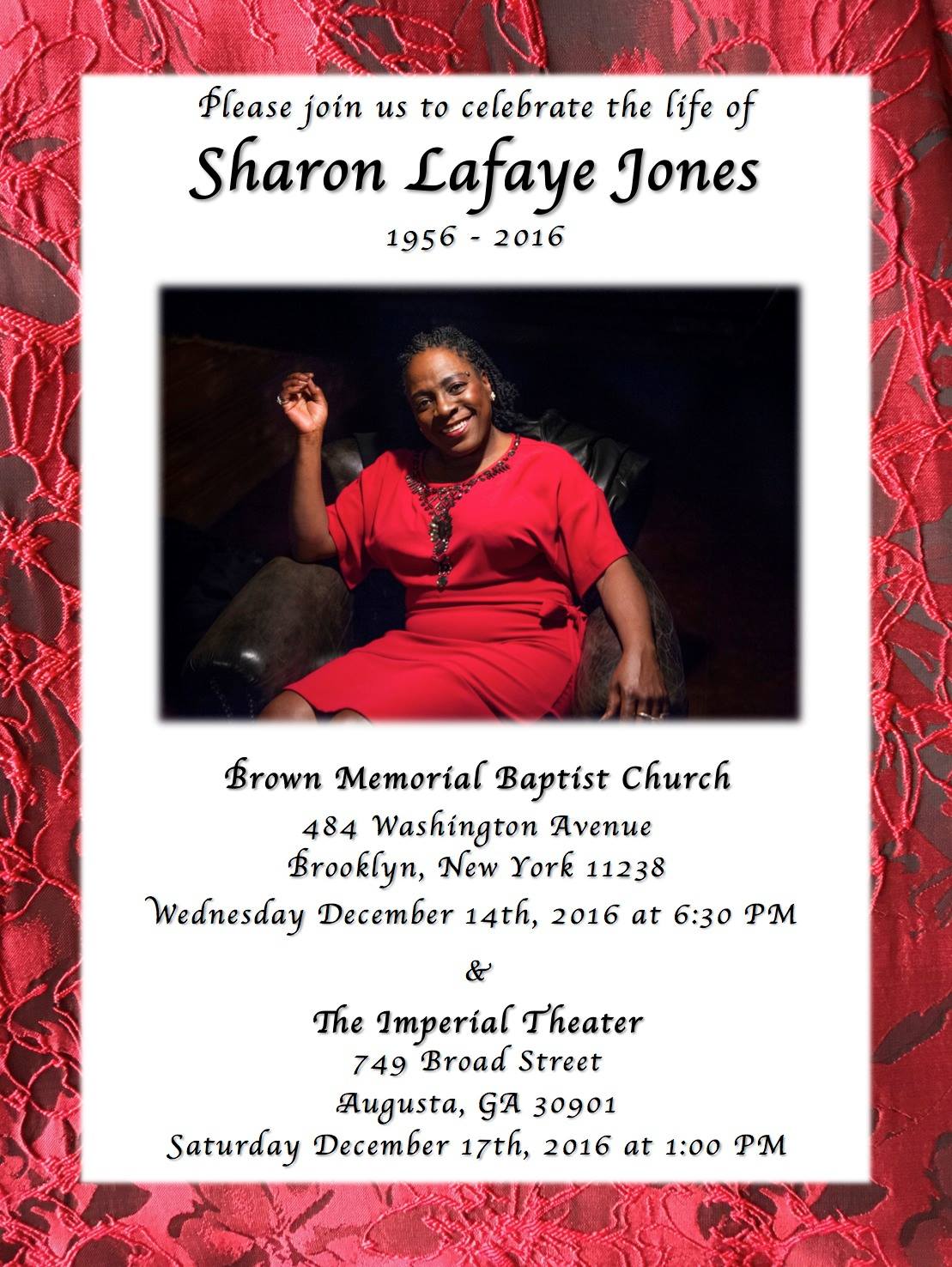 by Best Classic Bands Staff(Update Dec. 7): Memorial services were announced today for Jones in Brooklyn, NY on Dec. 14 and Augusta, GA on Dec. 17. (See the image below with the details.)