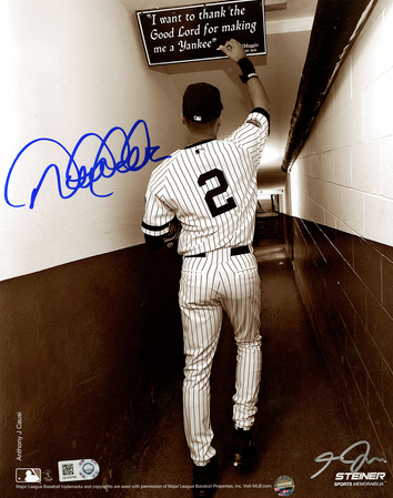 Jeter’s hand-signed photo showing him touching the framed quote from Joe DiMaggio “I want to thank the Good Lord for making me a Yankee”