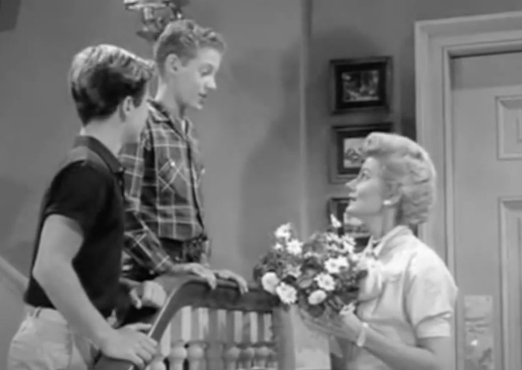 “Good morning, Mrs. Cleaver. That’s a very pretty dress.” Ken Osmond (center) as Eddie Haskell, with Tony Dow (Wally, at left) and Barbara Billingsley (June Clesver)