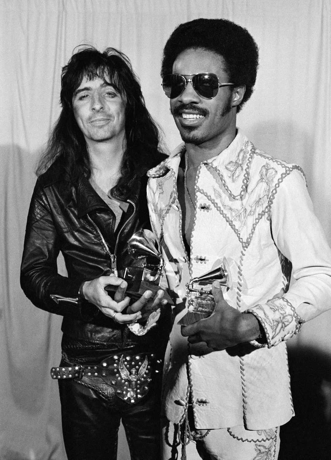 Alice Cooper, presenter, and Stevie Wonder, Album of the Year winner for Innervisions, at the 16th Annual Grammy Awards, March 2, 1974 (Photo: CBS Photo Archive ©1974)