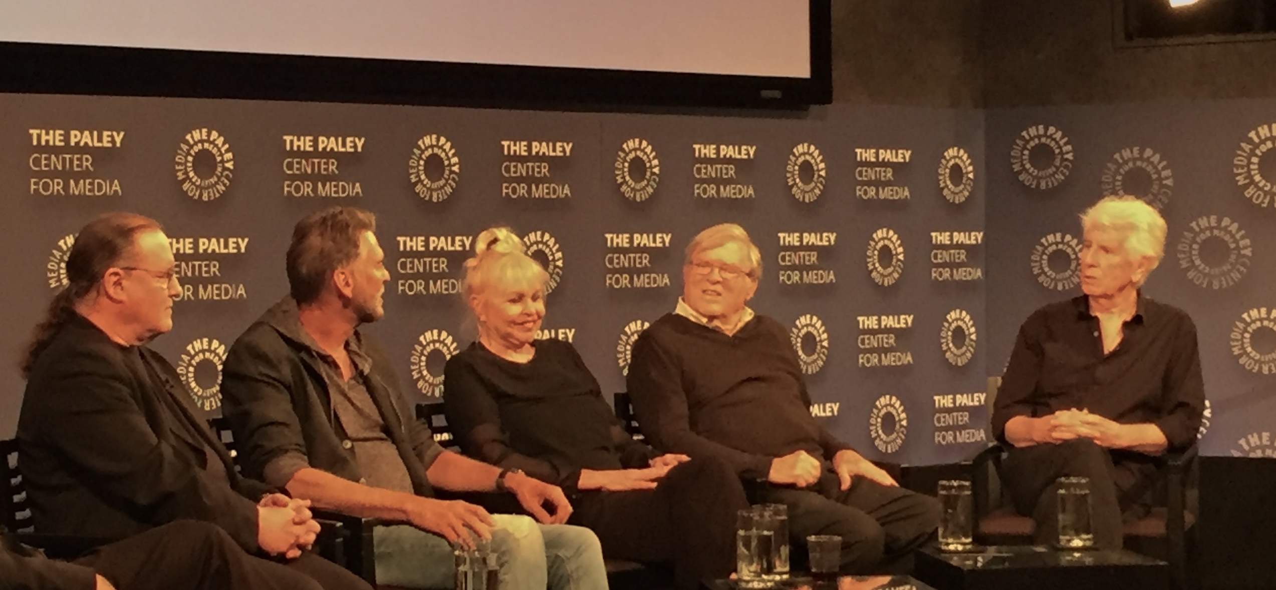 “All You Need is the Summer of Love” panel discussion, Paley Center, NYC, June 6, 2017. left to right: Allan Kozinn, Kenny Loggins, Michelle Phillips, D.A. Pennebaker, Graham Nash (Photo by Jeff Tamarkin)