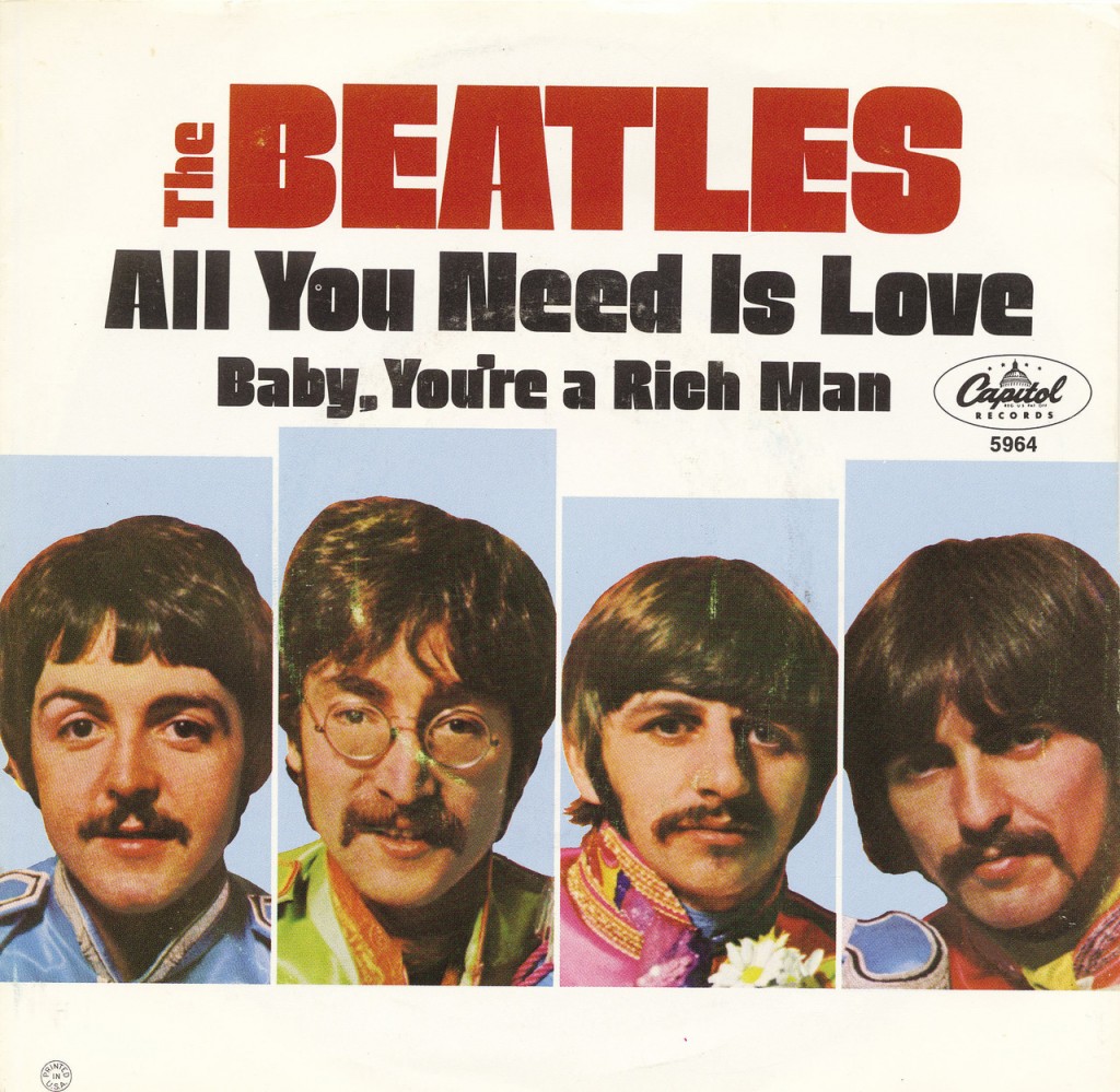 For the first-ever worldwide live satellite TV broadcast, The Beatles perform “All You Need Is Love” from Abbey Road studios to 400 million people