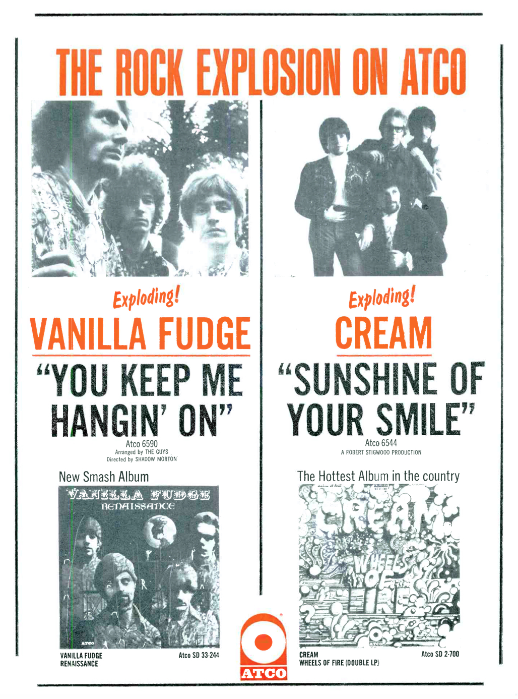 Their self-titled debut album followed shortly thereafter and, virtually overnight, the band found itself headlining major bills on both coasts as the album reached #6 on the sales chart. “You Keep Me Hangin’ On” was released as a single in July ’67 one year after the Supremes went to #1 with it but it was only a mid-chart success, reaching #48 on Record World. One year later, though a follow-up album was selling, the song was re-released as a single, and rose quickly up the chart. [Take a careful look at the ad in U.S music trade magazine, Record World. Not only are the photos of the new bands switched, they misidentified the name of Cream’s song.]
