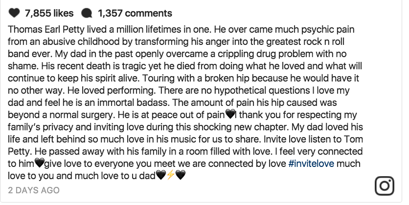 In the new statement by AnnaKim, she posted, “His recent death is tragic yet he died from doing what he loved and what will continue to keep his spirit alive. Touring with a broken hip because he would have it no other way. He loved performing. There are no hypothetical questions I love my dad and feel he is an immortal badass. The amount of pain his hip caused was beyond a normal surgery. He is at peace, out of pain. I thank you for respecting my family’s privacy and inviting love during this shocking new chapter. My dad loved his life and left behind so much love in his music for us to share. Invite love, listen to Tom Petty. He passed away with his family in a room filled with love. I feel very connected to him.”