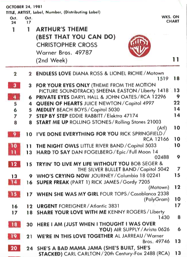 In case you forgot how dominant Genesis was, their Abacab album—released on September 14, 1981, and at #15 with a bullet this week—would become the second of the band’s five consecutive studio albums to hit #1 in the U.K. Despite Abacab‘s U.S. success—it was at the time their highest-charting album at #7—U.S. Top 40 radio programmers for the most part continued to ignore the band. (It would be another five years until pop radio finally embraced them.)