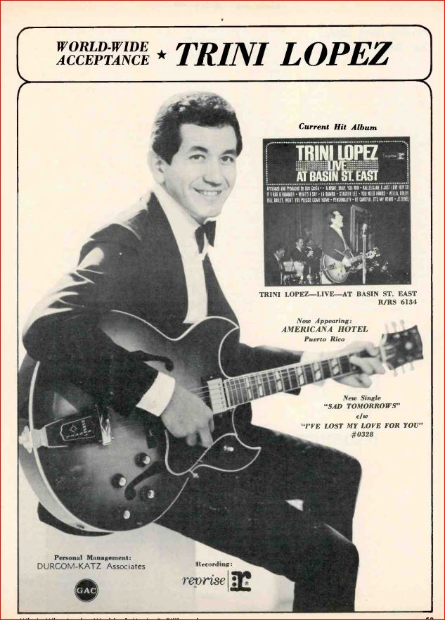 A sequel, More Trini Lopez at PJ’s, peaked later that year at #11. He placed 14 albums in all in Billboard, although none after 1967.