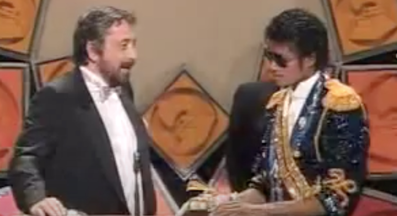 Walter Yetnikoff and Michael Jackson on stage at the 1984 Grammy Awards