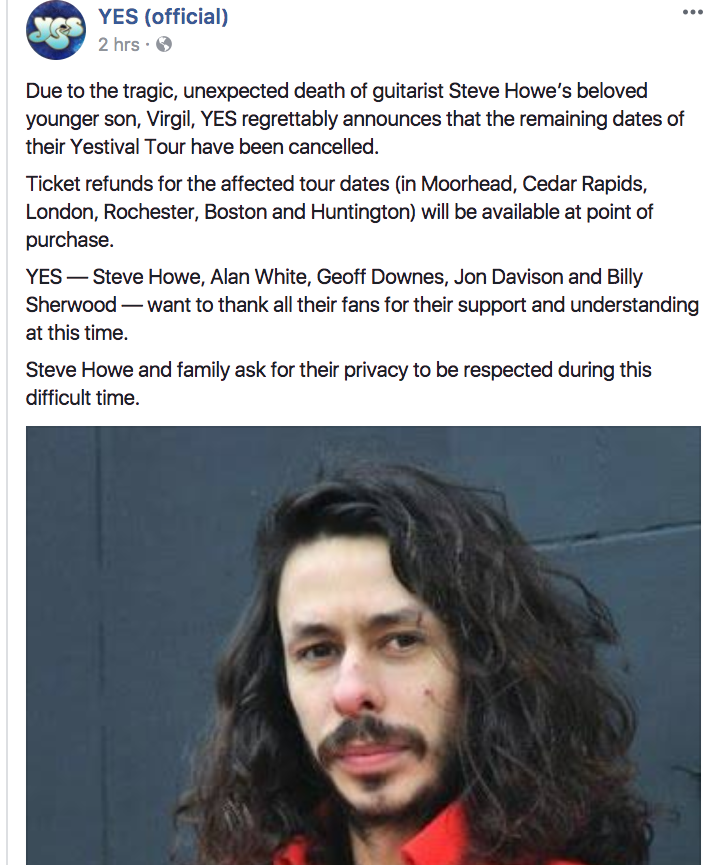 The Facebook post announcing the cancellation of Yestival due to the death of Steve Howe’s son, Virgil